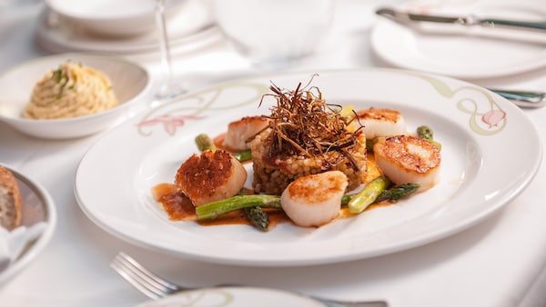 Dine in a serene splendor that recalls an elegant conservatory amid the foothills in France. The restaurant is home to custom-glass flower lights, white trellises, ornamental posts and—at the center—a delightful 7-foot tall cascading fountain featuring a fanciful stone cherub Mickey Mouse. Along the walls, frescoes of rolling hills mingling with lush greenery amid a magnificent blue sky add to the idyllic ambience.