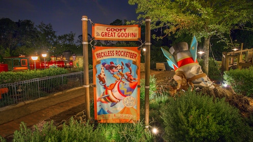Take flight above Storybook Circus with Goofy in a homemade stunt airplane for a thrilling junior roller coaster ride.